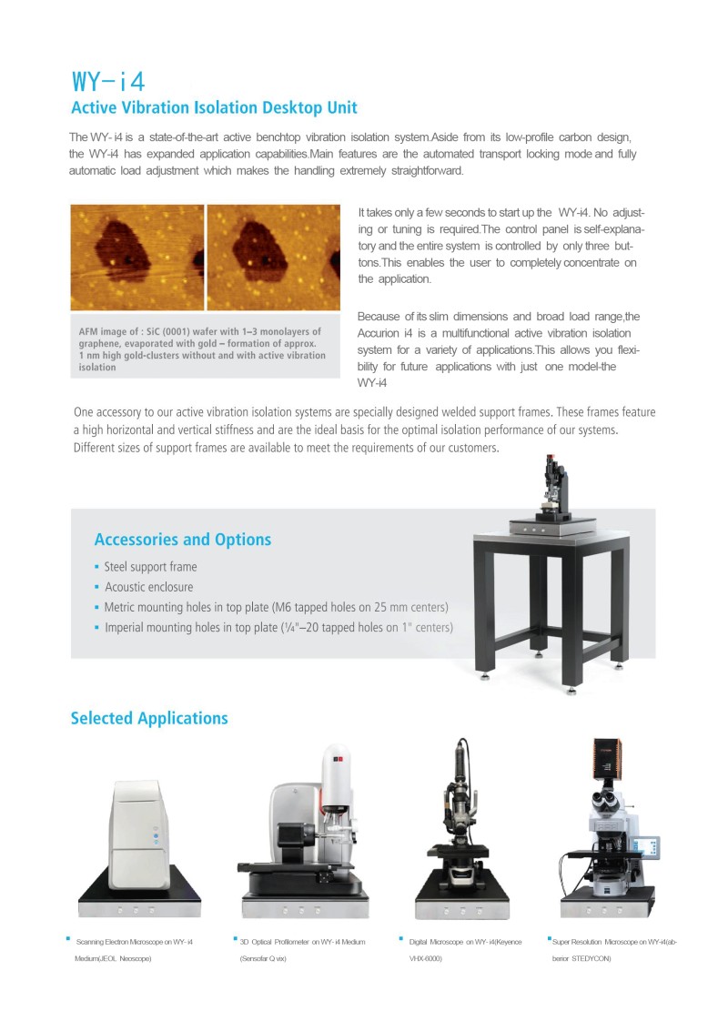 The WY- i4 is a state-of-the-art active benchtop vibration isolation system.Aside from its low-profile carbon design, the Accurion i4 has expanded application capabilities.Main features are the automated transport locking mode and fully automatic load adjustment which makes the handling extremely straightforward.